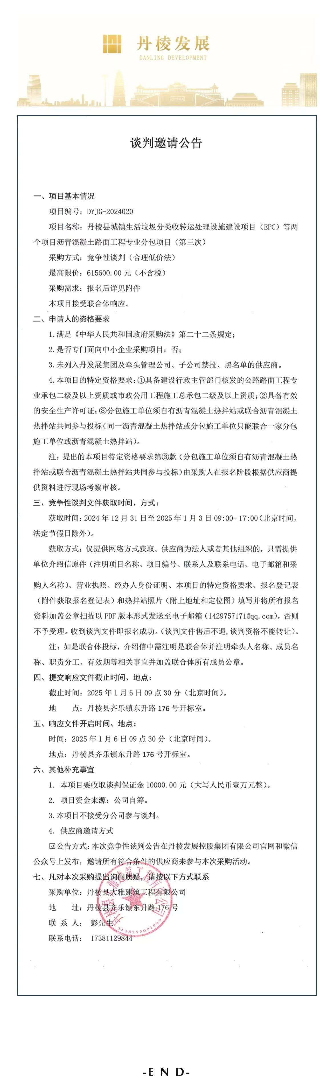丹棱縣城鎮(zhèn)生活垃圾分類收轉(zhuǎn)運處理設施建設項目(EPC)等兩個項目瀝青混凝土路面工程專業(yè)分包項目(第三次)談判邀請公告
