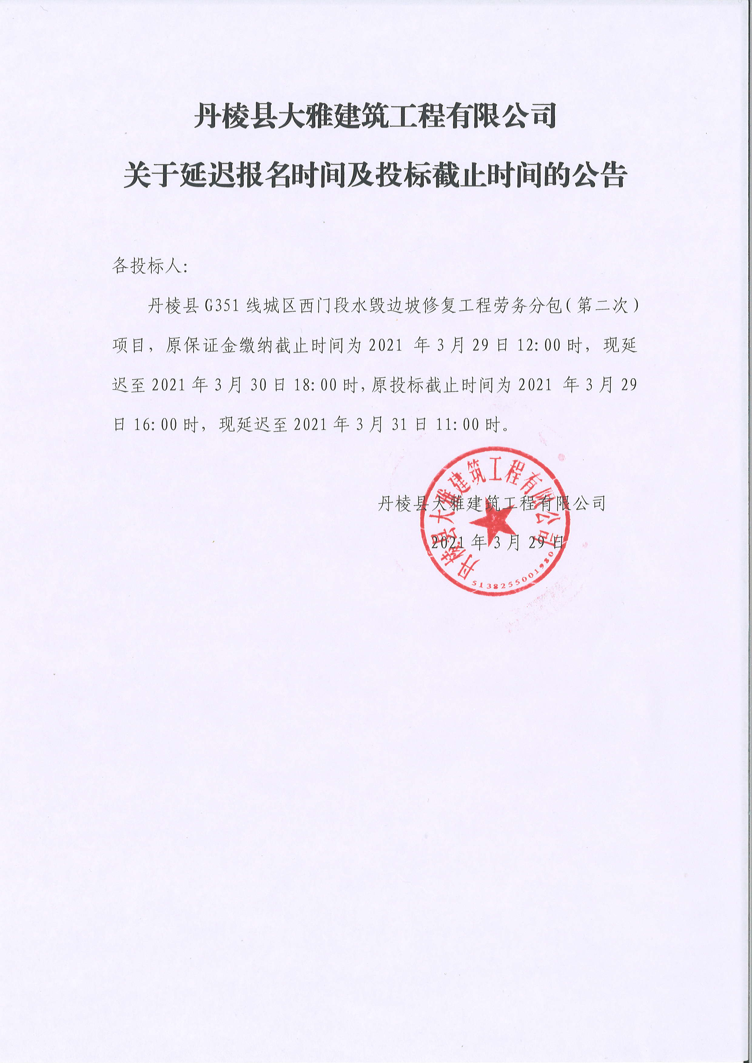 【大雅建筑公司】丹棱縣G351線城區(qū)西門段水毀邊坡修復(fù)工程勞務(wù)分包(第二次)延遲開標(biāo)時(shí)間公告