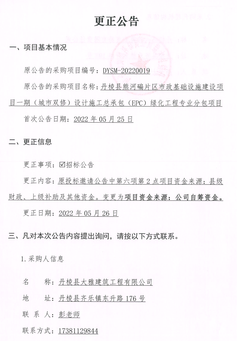 丹棱縣熊河碥片區(qū)市政基礎(chǔ)設(shè)施建設(shè)項(xiàng)目一期(城市雙修)設(shè)計(jì)施工總承包(EPC)綠化工程專業(yè)分包項(xiàng)目更正公告