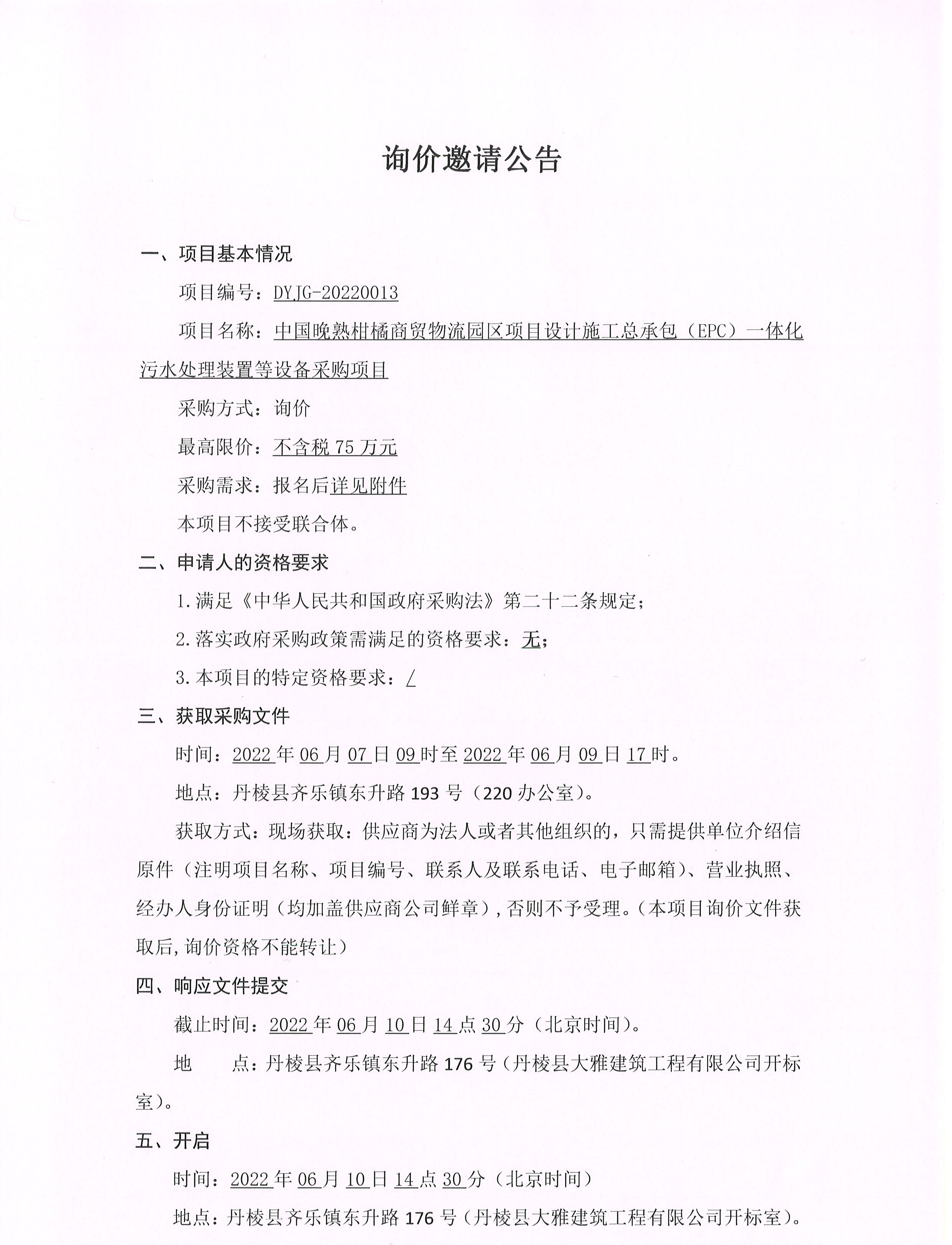 中國晚熟柑橘商貿(mào)物流園區(qū)項(xiàng)目設(shè)計(jì)施工總承包(EPC) 體化污水處理裝置等設(shè)備采購項(xiàng)目詢價(jià)邀請公告