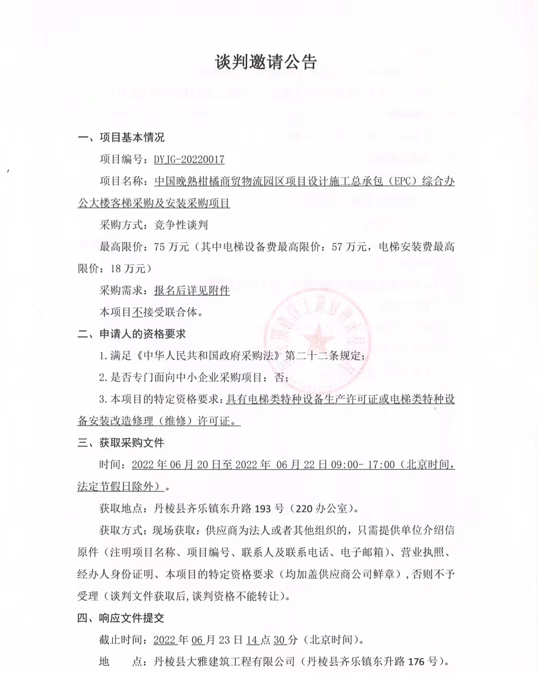 中國晚熟柑橘商貿(mào)物流園區(qū)項目設(shè)計施工總承包(EPC)綜合辦公大樓客梯采購及安裝采購項目談判邀請公告