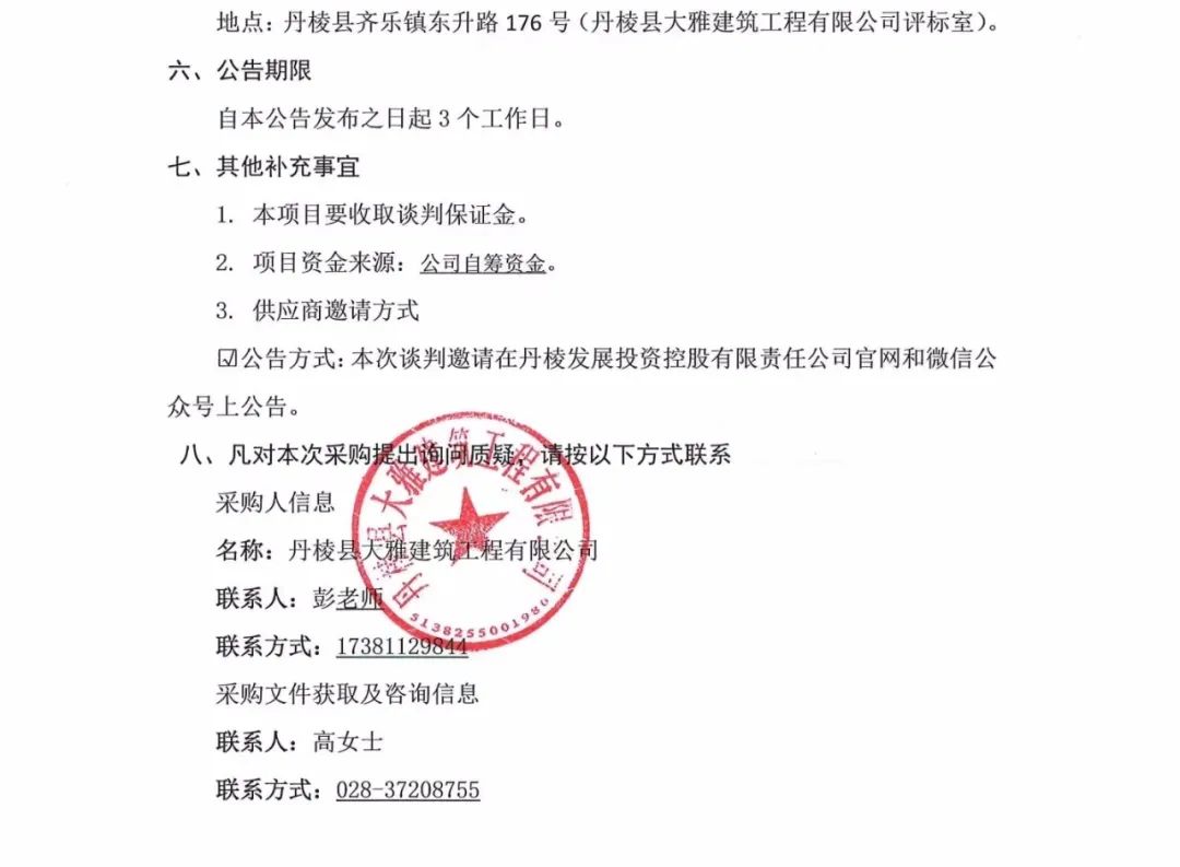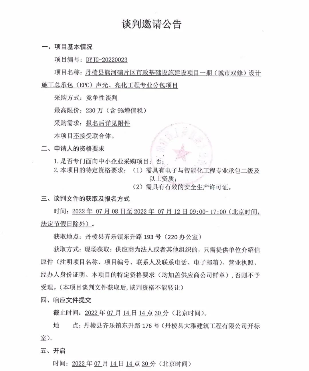 丹棱縣熊河碥片區(qū)市政基礎(chǔ)設(shè)施建設(shè)一期(城市雙修)設(shè)計(jì)施工總承包(EPC)聲光、亮化工程專(zhuān)業(yè)分包項(xiàng)目談判邀請(qǐng)公告