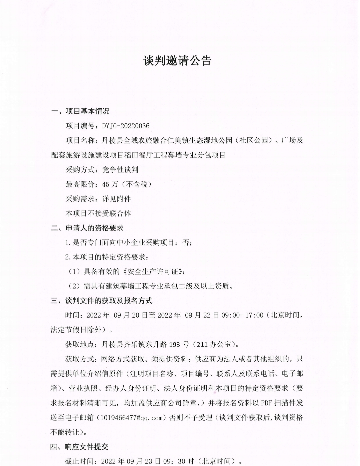 丹棱縣全域農(nóng)旅融合仁美鎮(zhèn)生態(tài)濕地公園(社區(qū)公園)、廣場(chǎng)及配套旅游設(shè)施建設(shè)項(xiàng)目稻田餐廳工程幕墻專(zhuān)業(yè)分包項(xiàng)目談判邀請(qǐng)公告