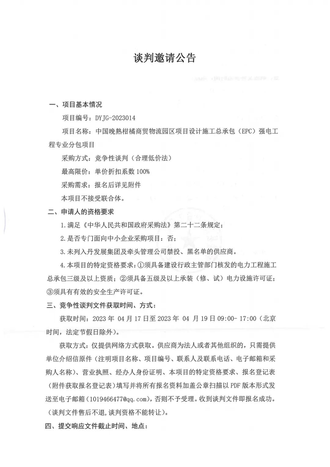 中國晚熟柑橘商貿(mào)物流園區(qū)項(xiàng)目設(shè)計(jì)施工總承包(EPC)強(qiáng)電工程專業(yè)分包項(xiàng)目談判邀請(qǐng)公告