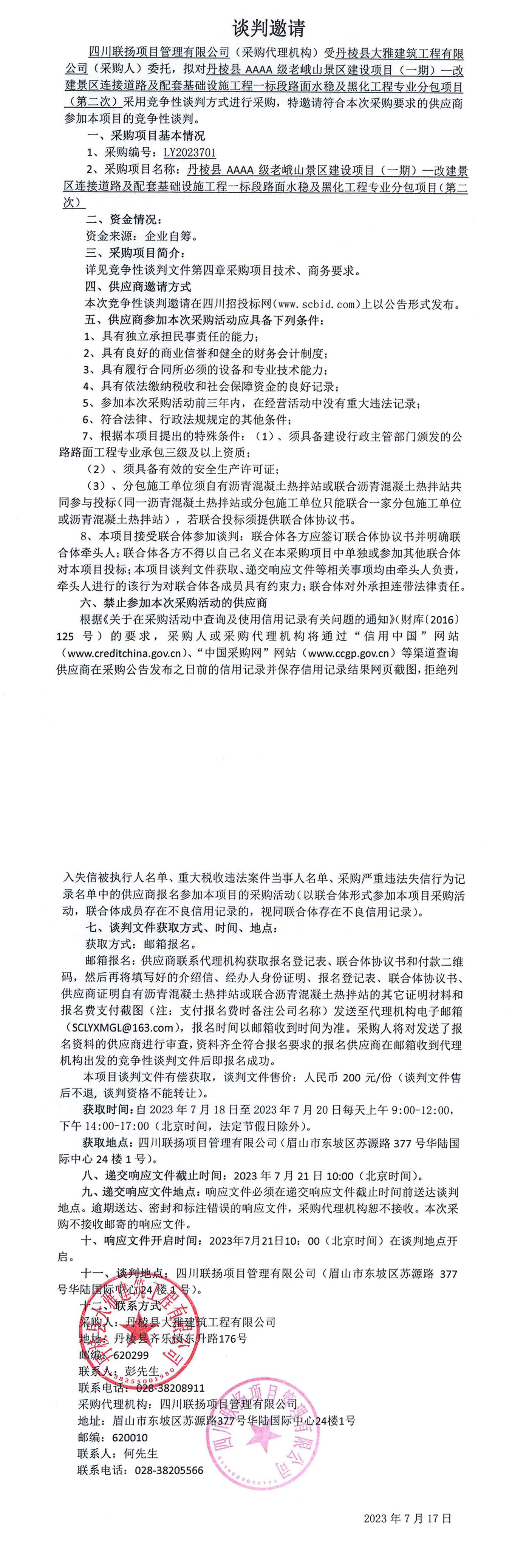 丹棱縣AAAA級老峨山景區(qū)建設(shè)項目(一期)—改建景區(qū)連接道路及配套基礎(chǔ)設(shè)施工程一標段水穩(wěn)及黑化工程專業(yè)分包談判邀請公告(第二次)