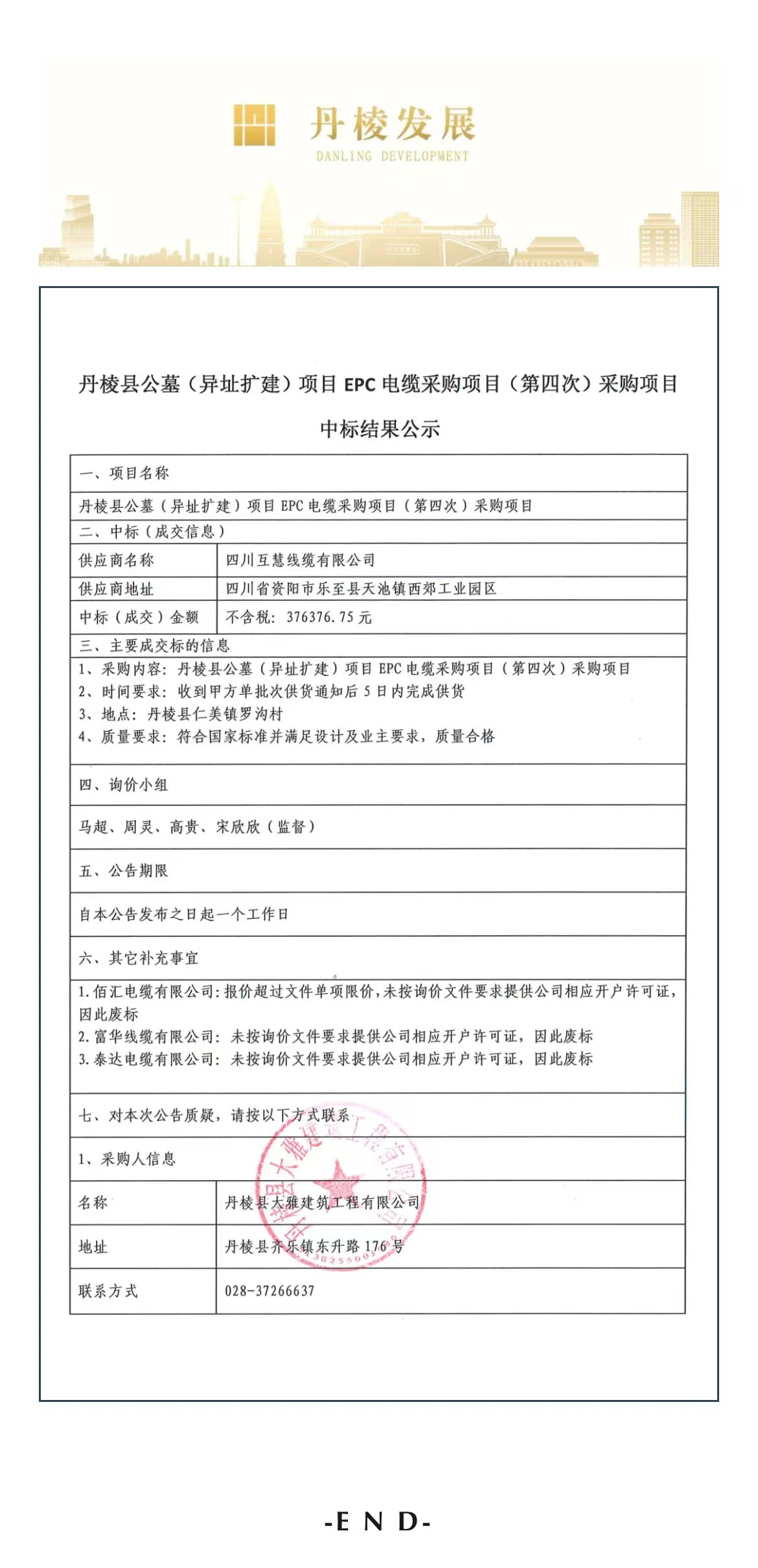 丹棱縣公墓(異址擴(kuò)建)項(xiàng)目EPC電纜采購(gòu)項(xiàng)目(第四次)采購(gòu)項(xiàng)目中標(biāo)結(jié)果公示