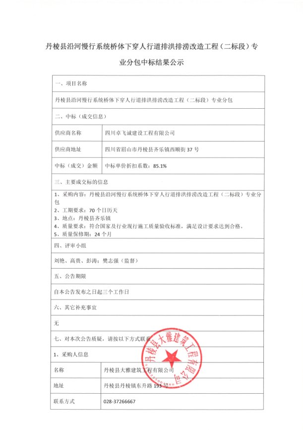 【大雅建筑公司】丹棱縣沿河慢行系統(tǒng)橋體下穿人行道排洪排澇改造工程(二標段)專業(yè)分包中標結果公示