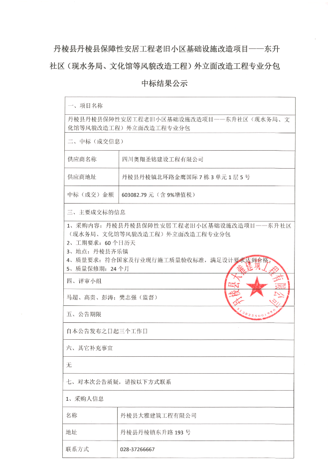 【大雅建筑公司】丹棱縣保障性安居工程老舊小區(qū)基礎(chǔ)設(shè)施改造項(xiàng)目--東升社區(qū)(現(xiàn)水務(wù)局、文化館等風(fēng)貌改造工程)外立面改造工程專(zhuān)業(yè)分包中標(biāo)結(jié)果公示