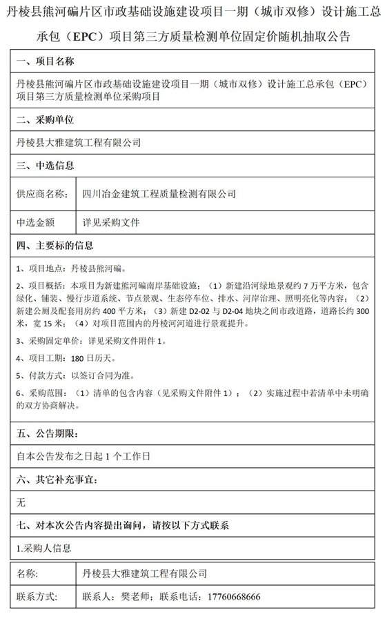丹棱縣熊河碥片區(qū)市政基礎(chǔ)設(shè)施建設(shè)項目一期(城市雙修)設(shè)計施工總承包(EPC)項目第三方質(zhì)量檢測單位固定價隨機抽取公告