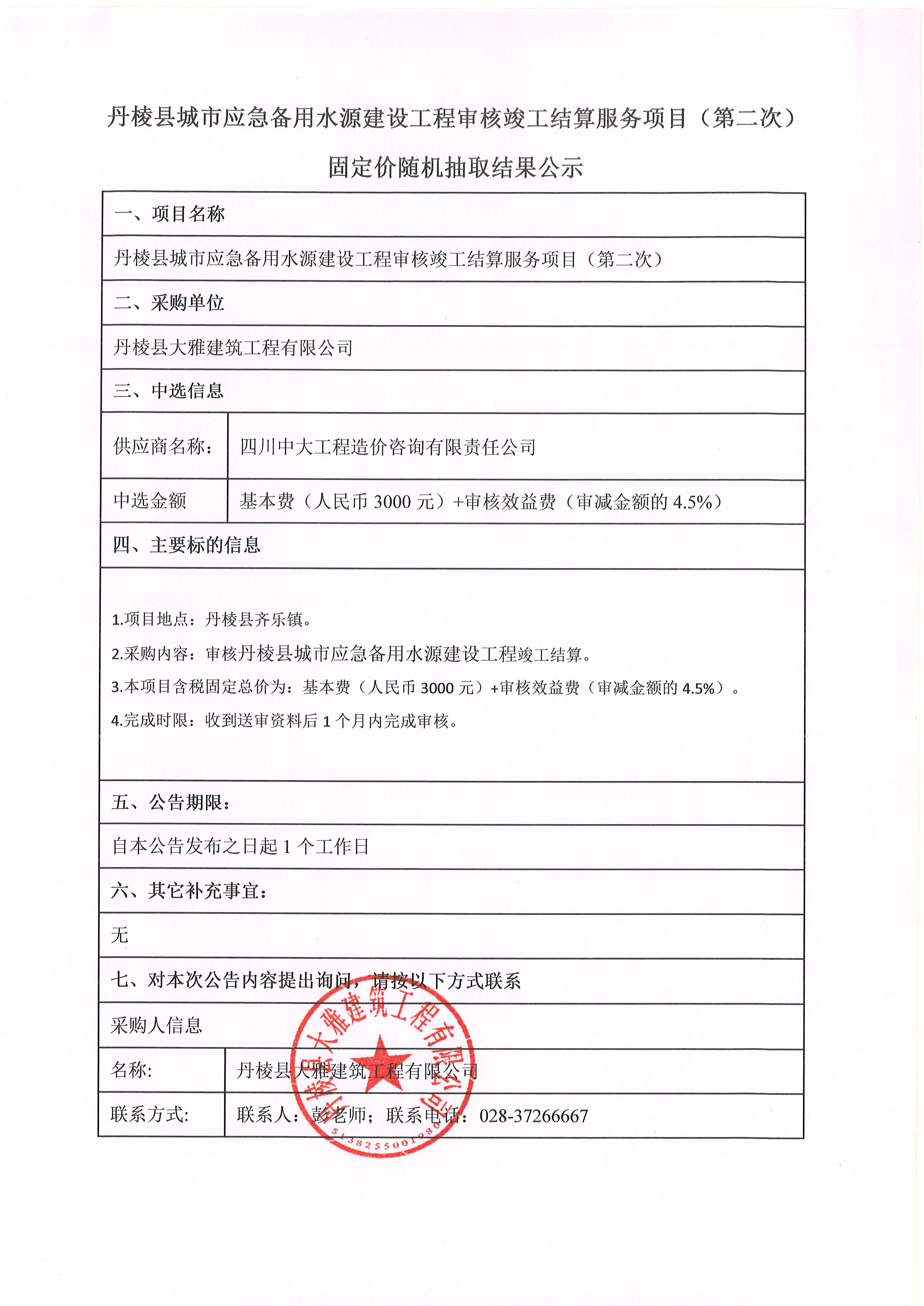 丹棱縣城市應(yīng)急備用水源建設(shè)工程審核竣工結(jié)算服務(wù)項(xiàng)目(第二次) 固定價(jià)隨機(jī)抽取結(jié)果公示