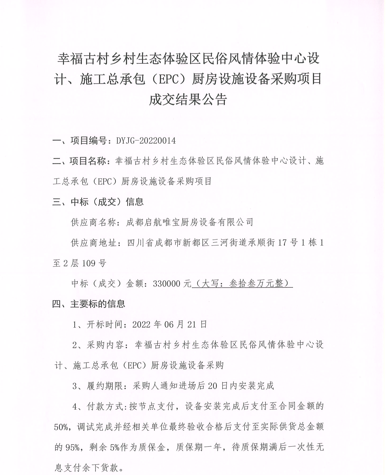 幸福古村鄉(xiāng)村生態(tài)體驗(yàn)區(qū)民俗風(fēng)情體驗(yàn)中心設(shè)計、施工總承包(EPC)廚房設(shè)施設(shè)備采購項(xiàng)目成交結(jié)果公告
