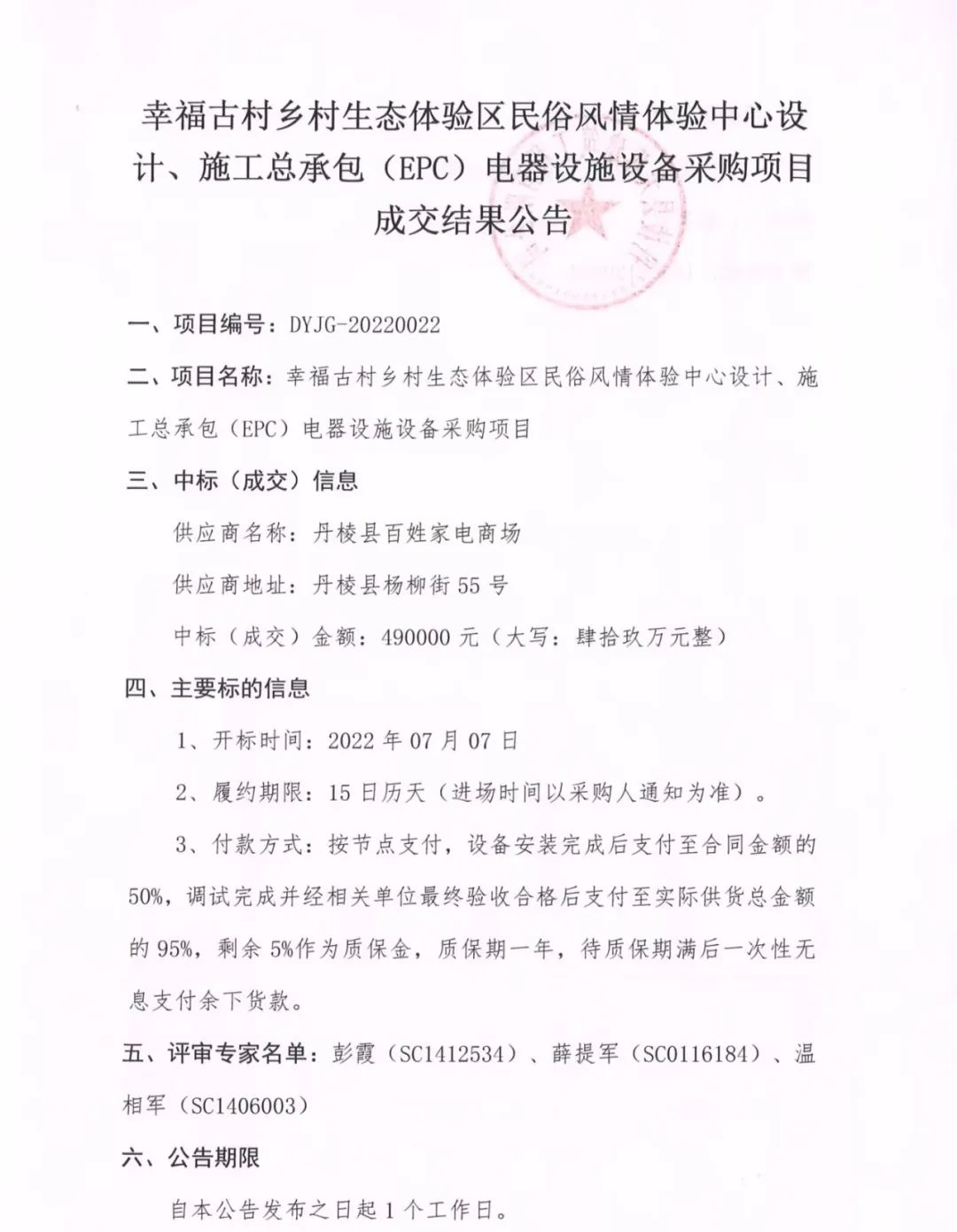 幸福古村鄉(xiāng)村生態(tài)體驗區(qū)民俗風情體驗中心設計、施工總承包(EPC)電器設施設備采購項目成交結果公告