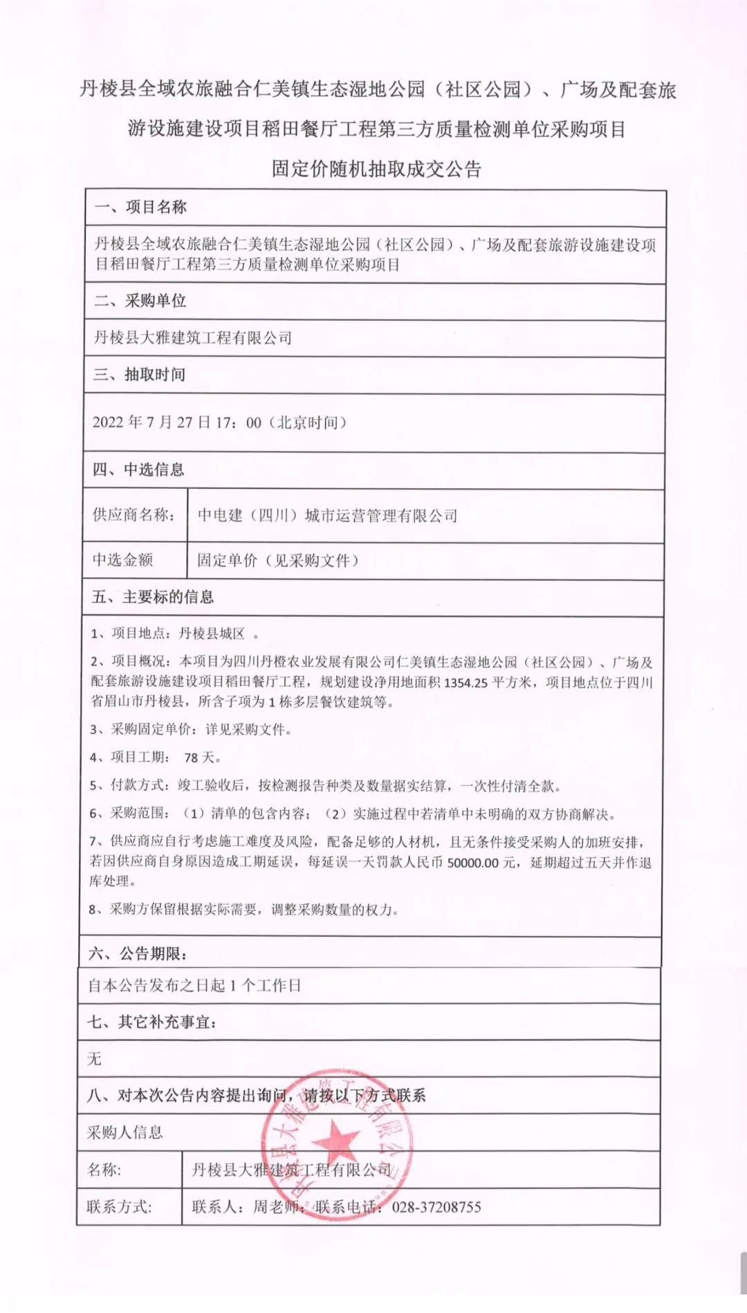 仁美鎮(zhèn)生態(tài)濕地公園(社區(qū)公園)、廣場及配套旅游設(shè)施建設(shè)項目稻田餐廳工程第三方質(zhì)量檢測單位采購項目固定價隨機抽取成交公告