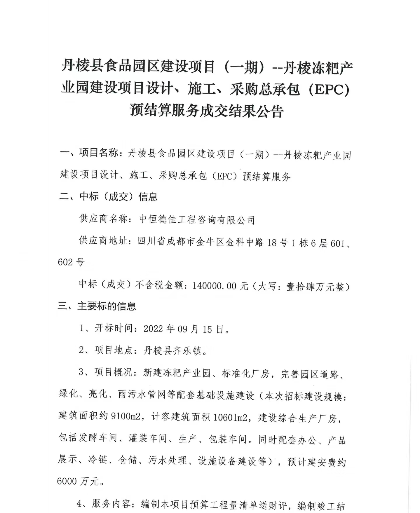 丹棱縣食品園區(qū)建設(shè)項目(一期)--丹棱凍粑產(chǎn)業(yè)園建設(shè)項目設(shè)計、施工、采購總承包(EPC)預(yù)結(jié)算服務(wù)成交結(jié)果公告