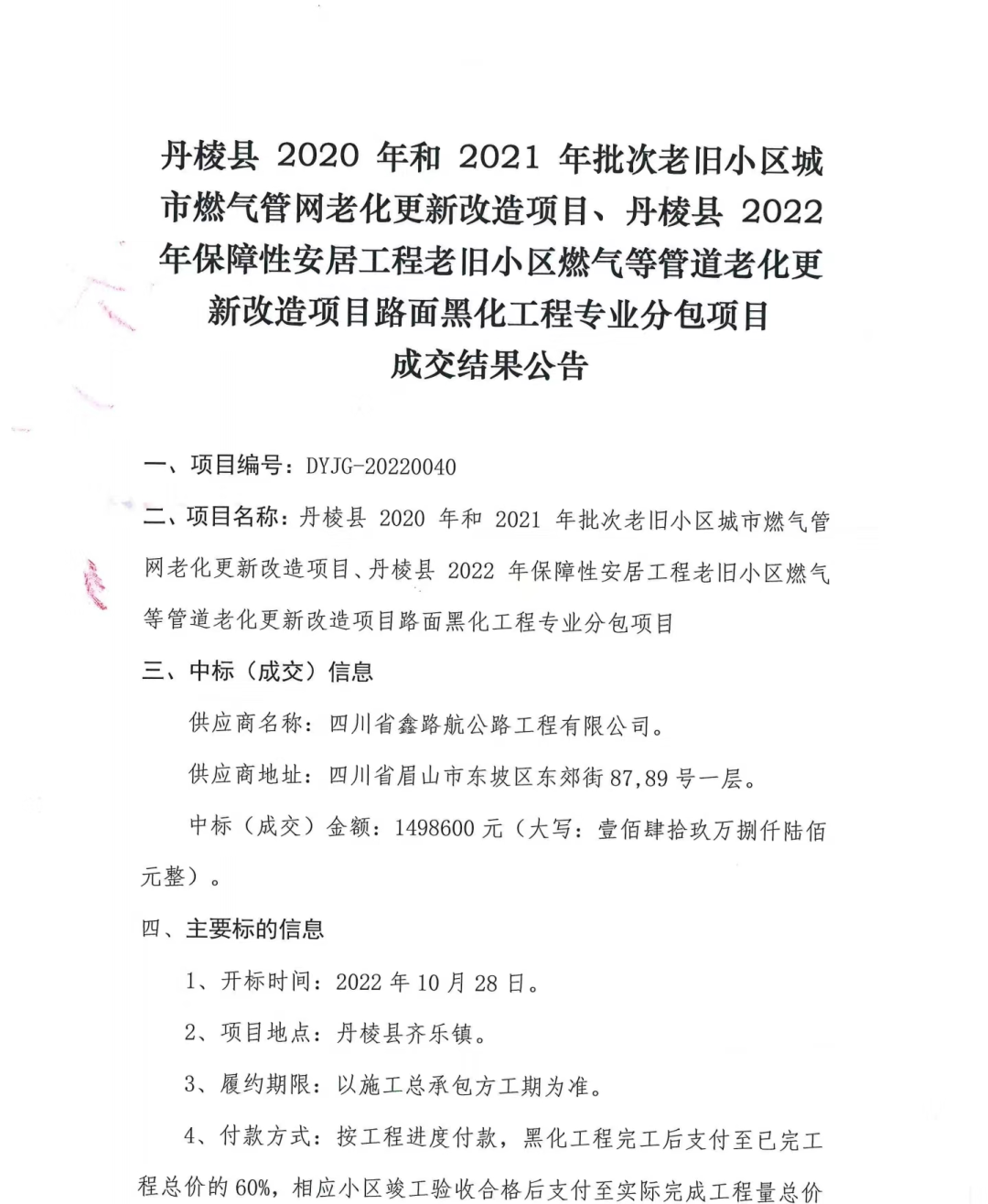 丹棱縣2020年、2021年、2022年保障性安居工程老舊小區(qū)燃?xì)獾裙艿览匣赂脑祉?xiàng)目路面黑化工程專(zhuān)業(yè)分包項(xiàng)目成交結(jié)果公告
