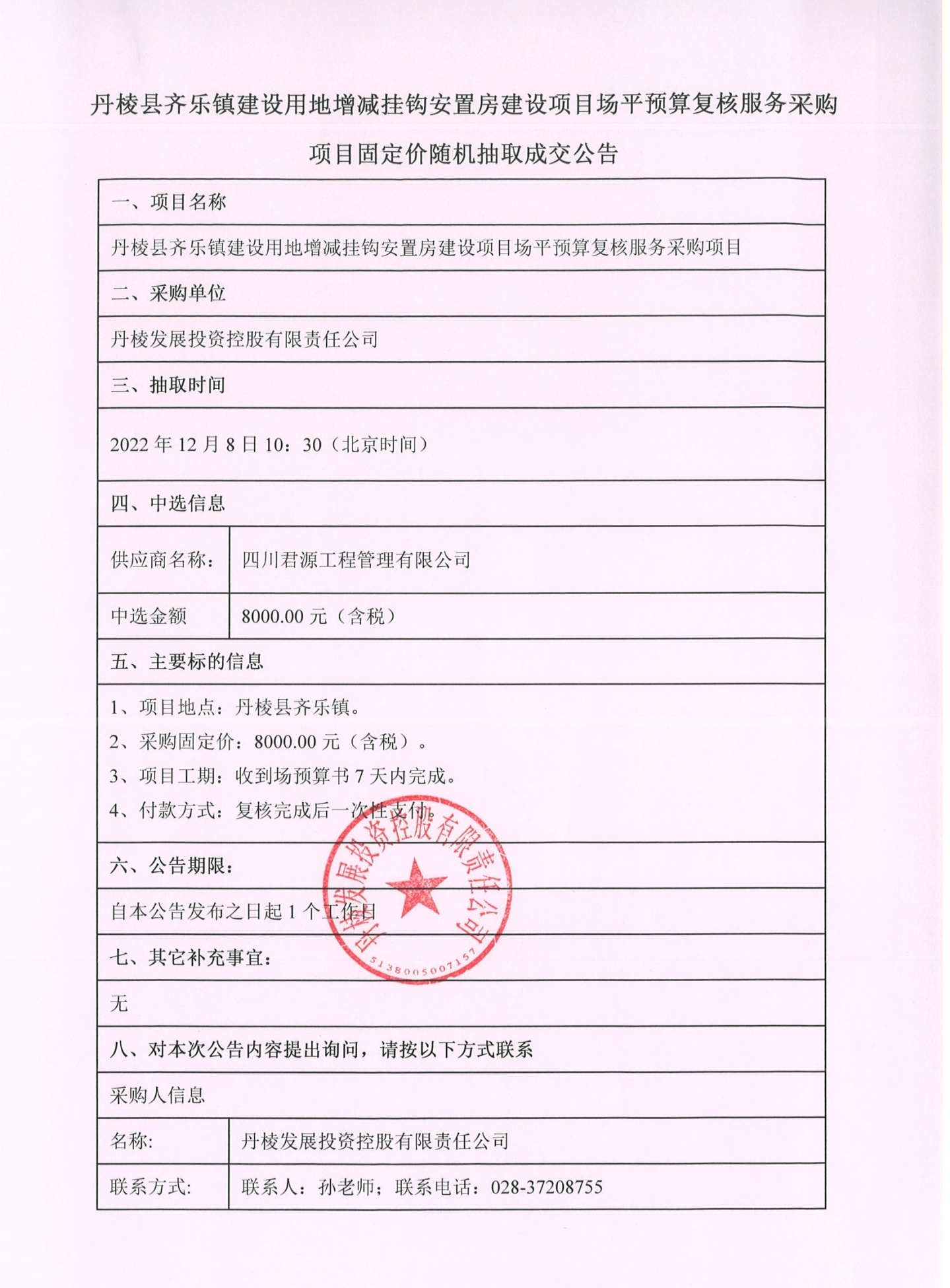 丹棱縣齊樂鎮(zhèn)建設用地增減掛鉤安置房建設項目場平預算復核服務采購項目固定價隨機抽取成交公告