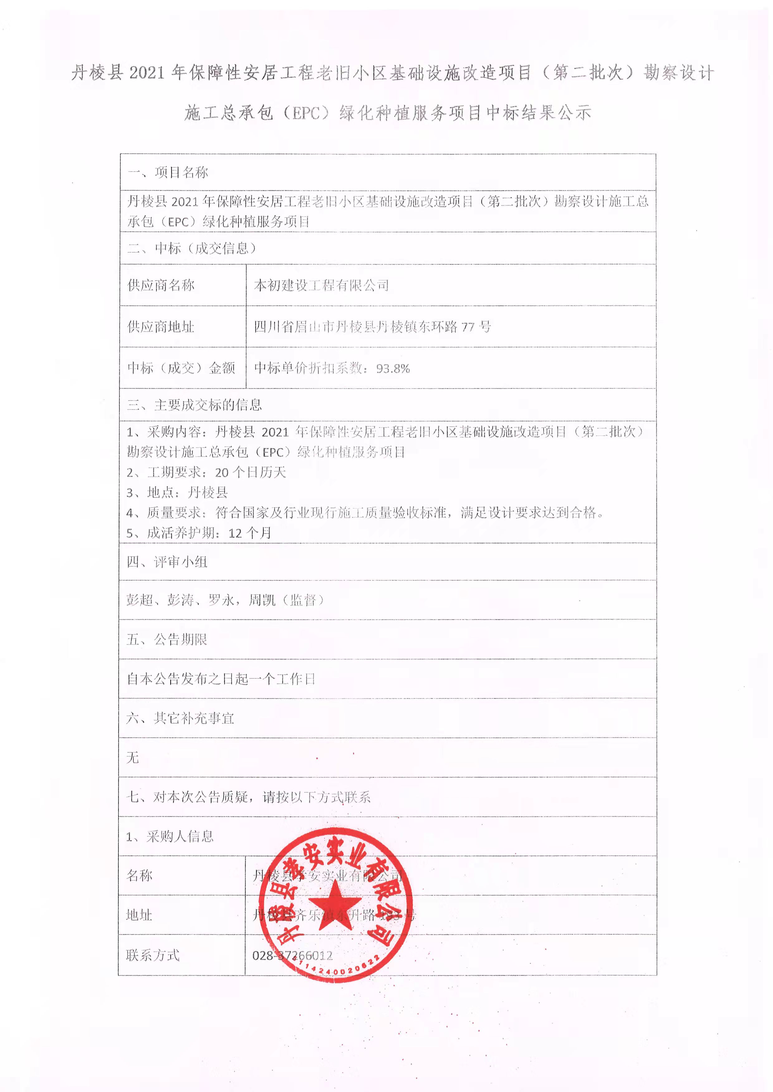 【縣孝安公司】丹棱縣2021年保障性安居工程老舊小區(qū)基礎(chǔ)設(shè)施改造項(xiàng)目(第二批次)勘察設(shè)計(jì)施工總承包(EPC)綠化種植服務(wù)項(xiàng)目中標(biāo)結(jié)果公示