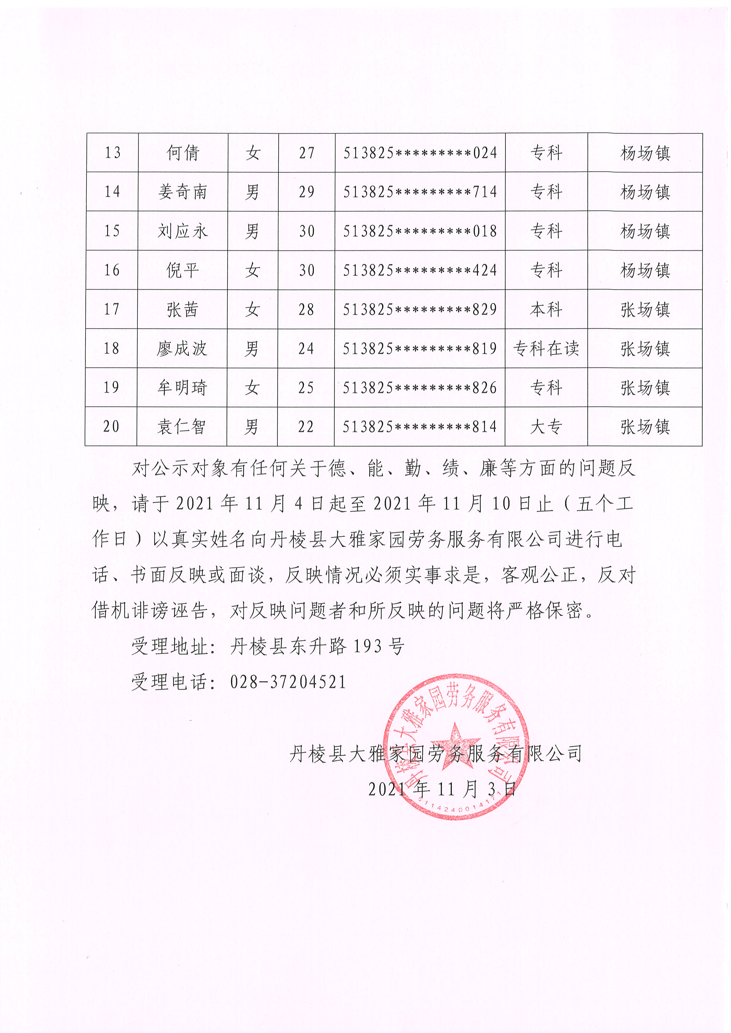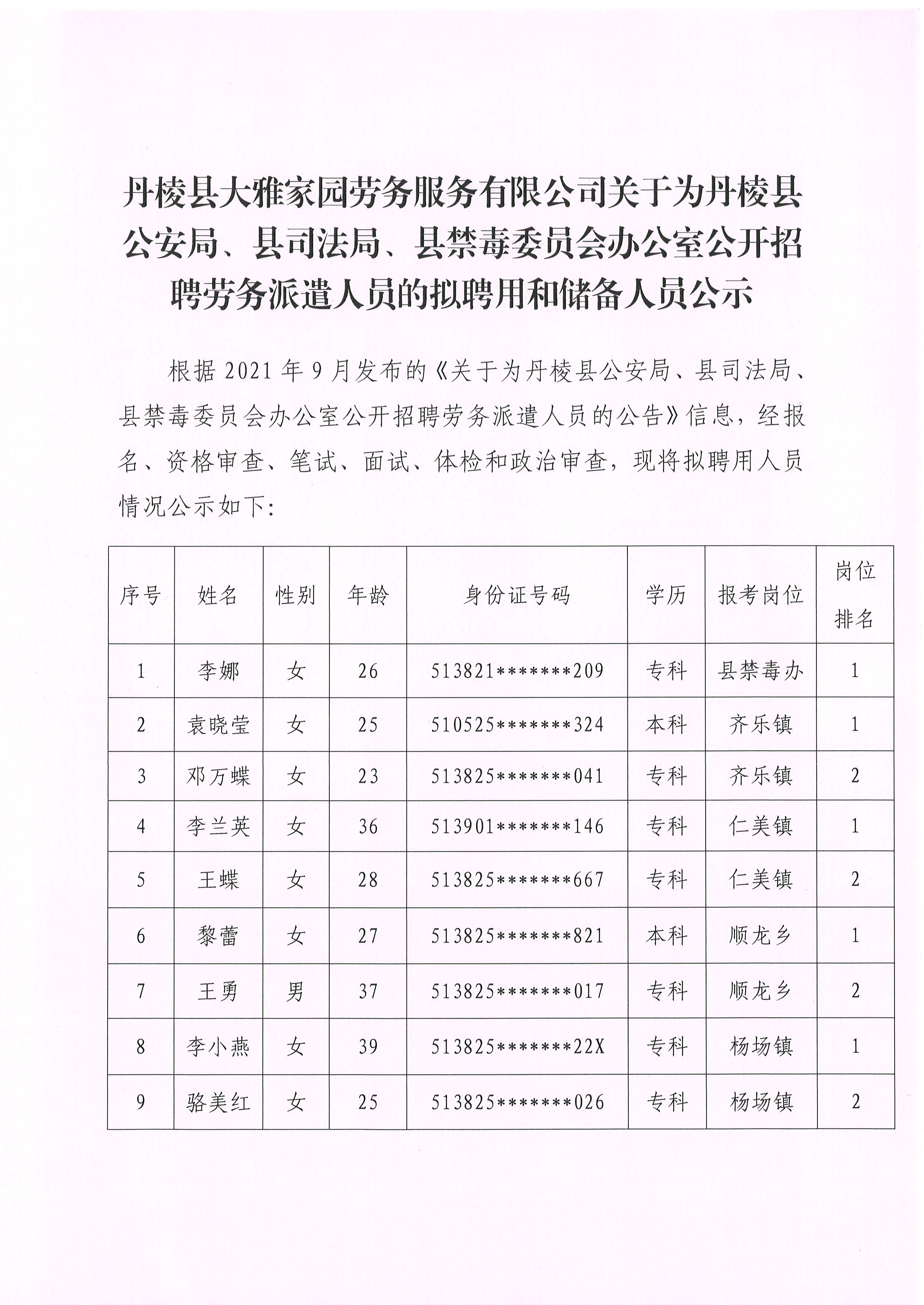 【大雅勞務(wù)公司】丹棱縣大雅家園勞務(wù)服務(wù)有限公司關(guān)于為丹棱縣公安局、縣司法局、縣禁毒委員會(huì)辦公室公開(kāi)招聘勞務(wù)派遣人員的擬聘用和儲(chǔ)備人員公示