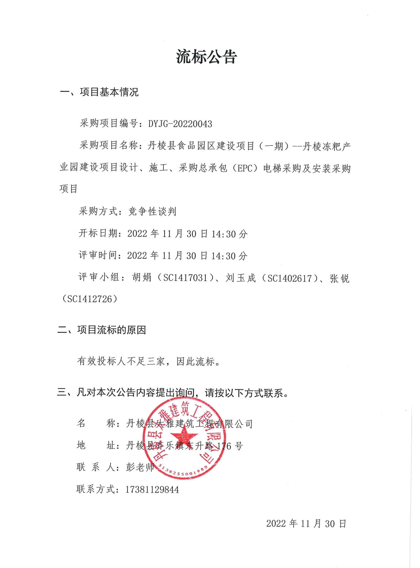 丹棱縣食品園區(qū)建設(shè)項目 (一期)--丹棱凍粑產(chǎn)業(yè)園建設(shè)項目設(shè)計、施工、采購總承包 (EPC) 電梯采購及安裝采購項目流標公告